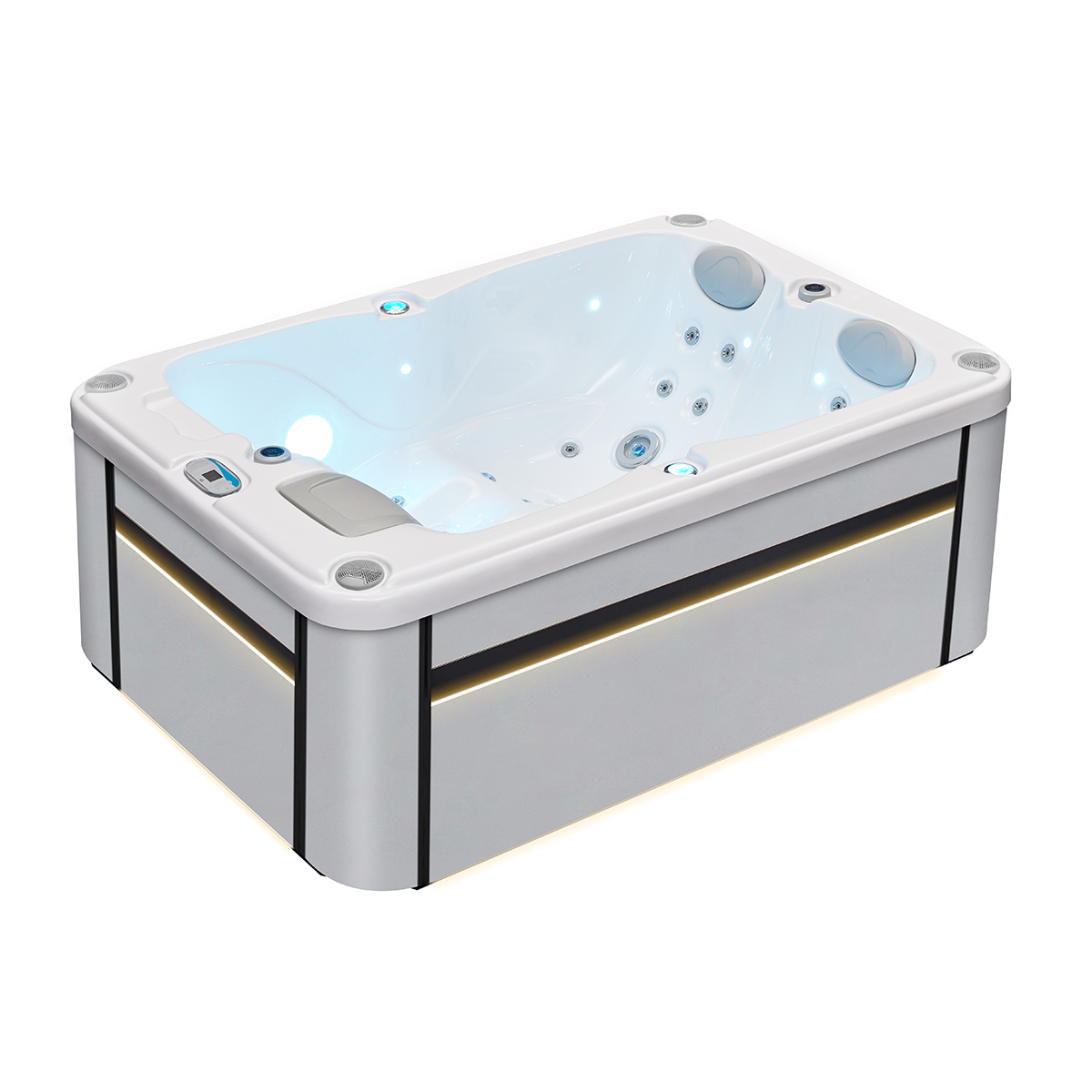 The outdoor Hot Tub adopts an integrated tank design, featuring a modern and minimalist appearance, primarily in light colors, with a neat and elegant overall shape. The top of the tank is equipped with massage components that provide a relaxing experience for users through water flow massage. It also features lighting fixtures that can create a cozy or atmospheric usage scene