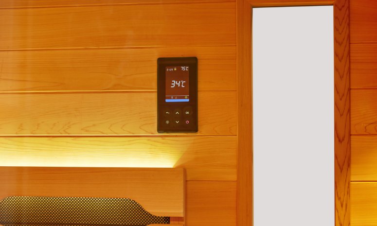 The sauna room is equipped with brilliant lighting that enhances the ambiance, creating a calming and relaxing atmosphere.
