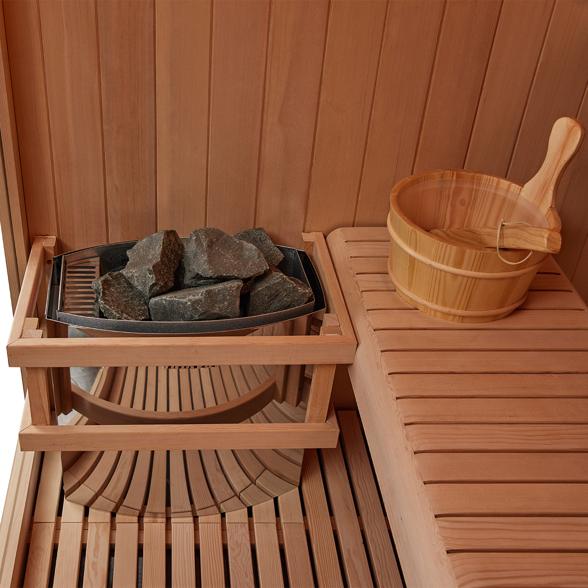 The stove frame made of selected high-quality wood not only enhances the natural beauty of the sauna room, but also effectively insulates and ensures safe use.