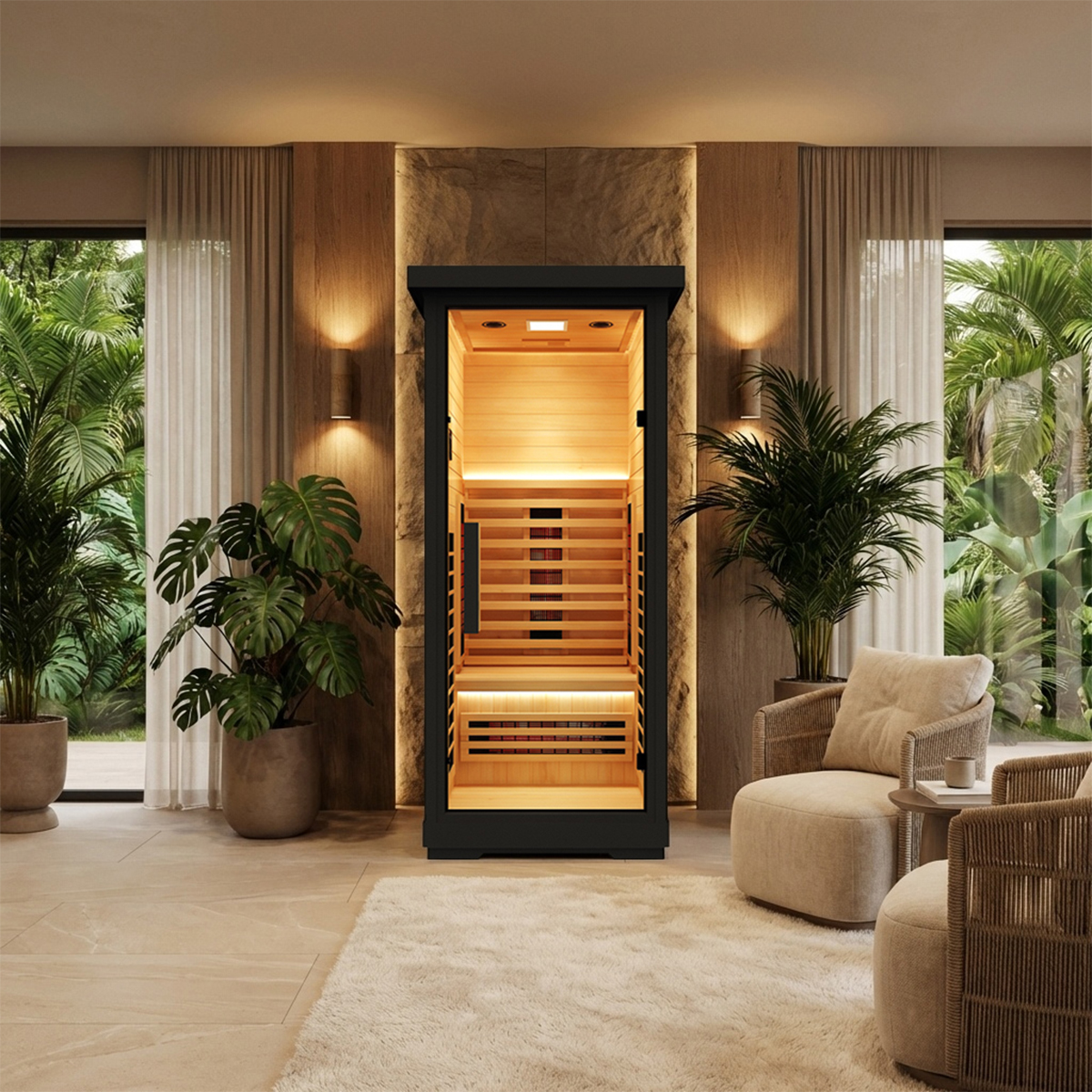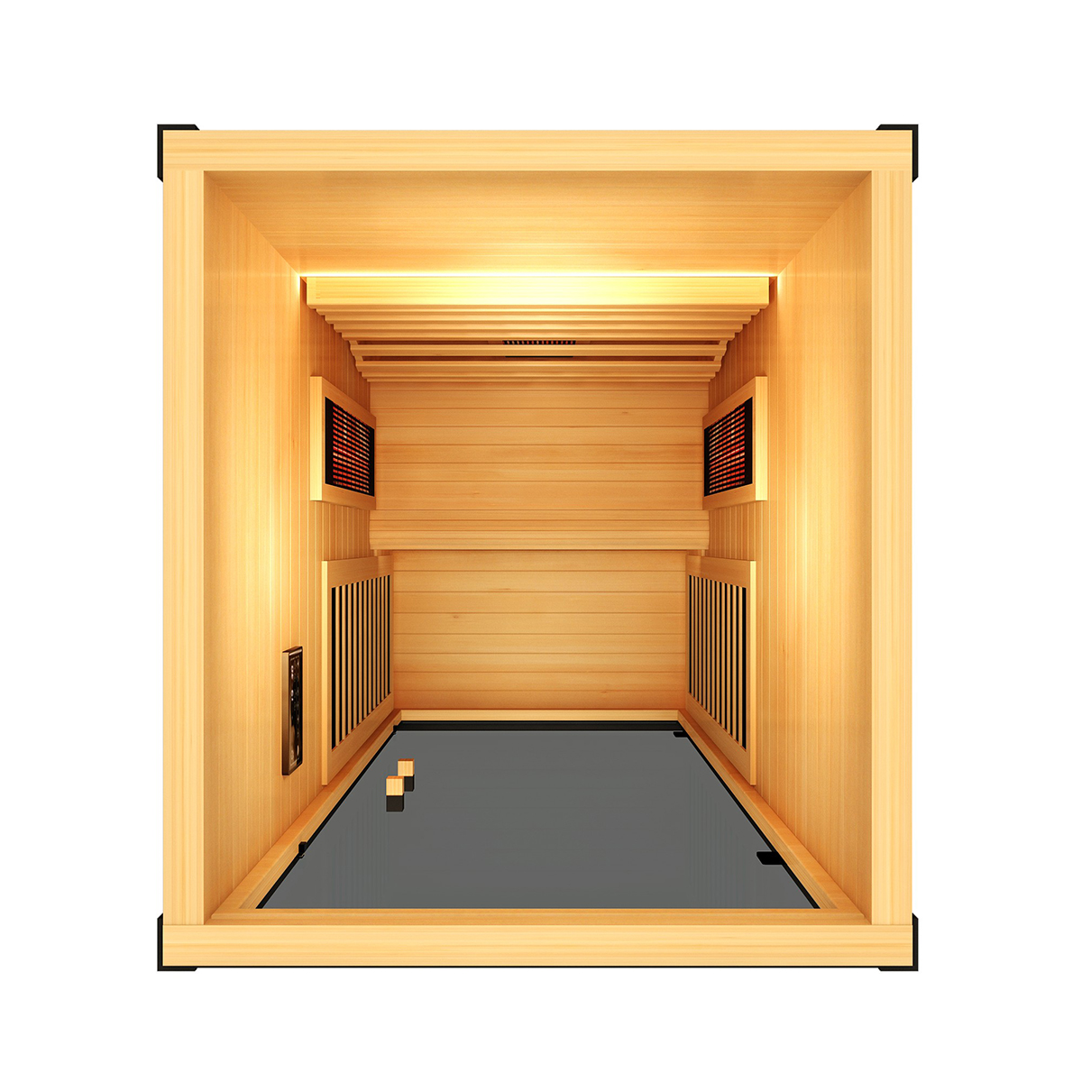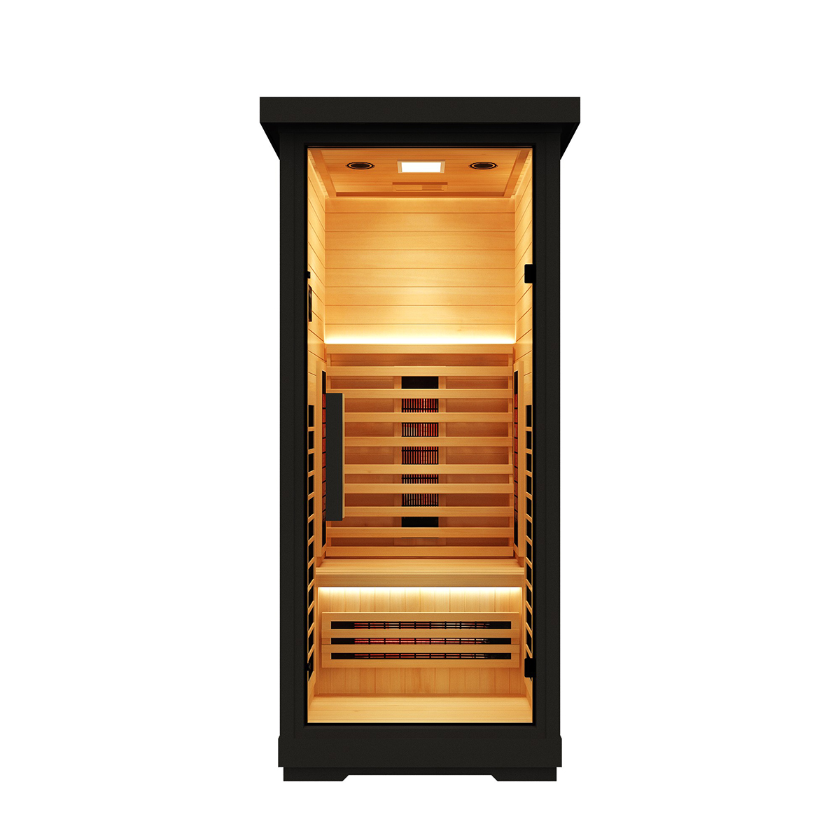 This sauna room is carefully made of high-quality wood, which is natural and environmentally friendly, high temperature resistant and exudes a light wood fragrance, adding a sense of tranquility and relaxation to your sauna experience. Equipped with a smart control panel, you can easily adjust the temperature and time, and accurately control the sauna experience. In addition, the built-in Bluetooth audio system allows you to play your favorite music while enjoying the sauna, creating a more pleasant and relaxing atmosphere.