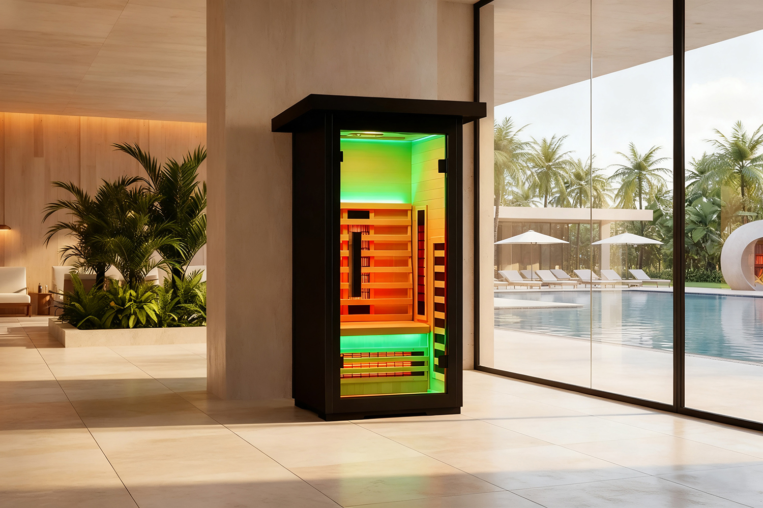 The sauna room features an oxygen bar function, providing pure oxygen to enhance breathing quality and improve relaxation.