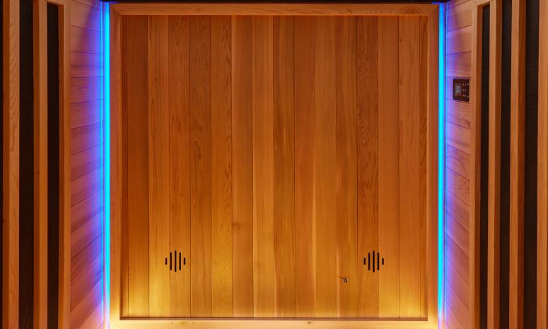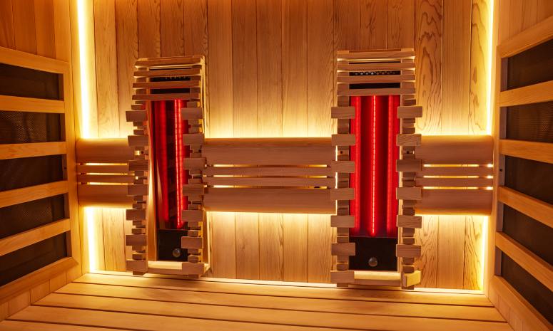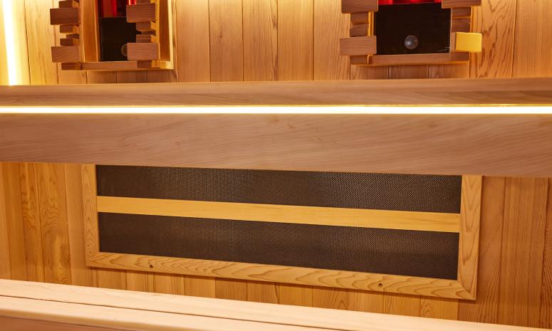 The far infrared heating box in the sauna emits deep-penetrating heat, promoting relaxation, improved circulation, and detoxification.