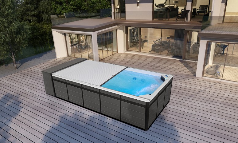OF-120T swim spa combines elite fitness training with luxury hydrotherapy relaxation.